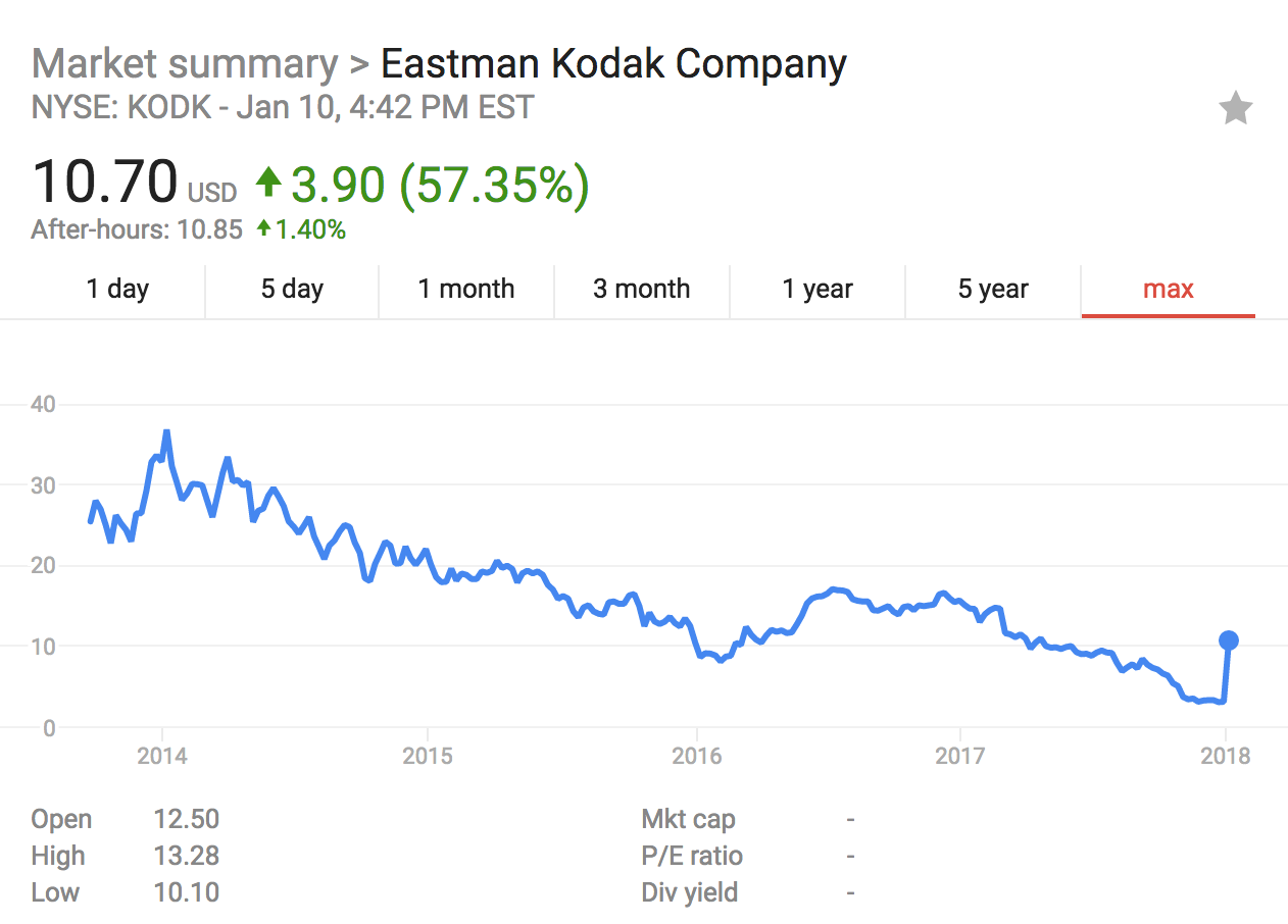By getting boomers to try out and understand cryptocurrency and blockchain technology, Kodak could do for cryptocurrency what eBay did for PayPal. This mass adoption is an important step if cryptocurrency is to go mainstream, and in many ways a smart move by Kodak, whose waning brand is their greatest asset. So this means great things for Kodak, right? Well, probably not.